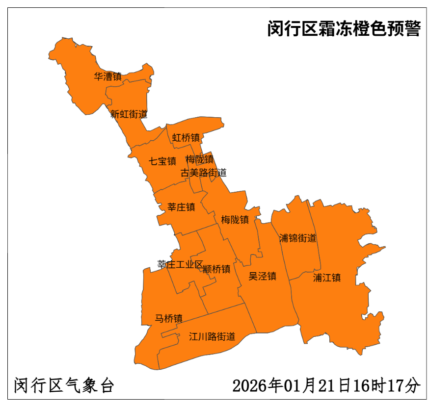 闵行区气象台2026年01月21日16时17分发布霜冻橙色预警信号: